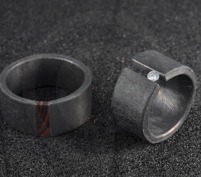 Alliances de mariage en tantale griffé , sertie pression d’un diamant pour Elle et de bois de violette pour Lui