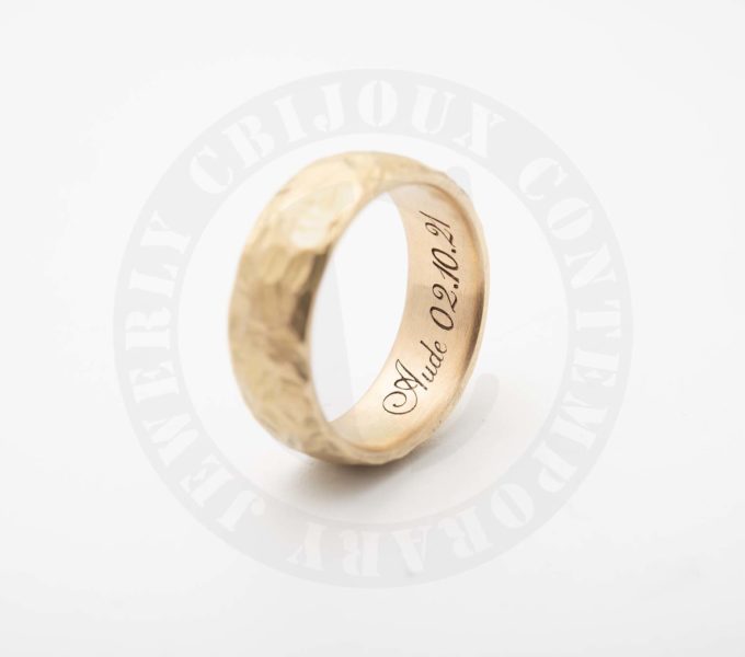 Bague de fiançailles en or rose » Précédent Suivant » Retour Bague de fiançailles en or rose Consultez le guide pour créer sa bague de fiançailles unique pour avoir une meilleure idée sur ma démarche pour réaliser une bague sur commande. Consultez mon petit guide pour créer son bijou contemporain pour mieux comprendre ma démarche pour créer des bagues personnalisées . or rose profil bombé aspect "brut" gravure laser ~1200.- demander des informations supplémentaires
