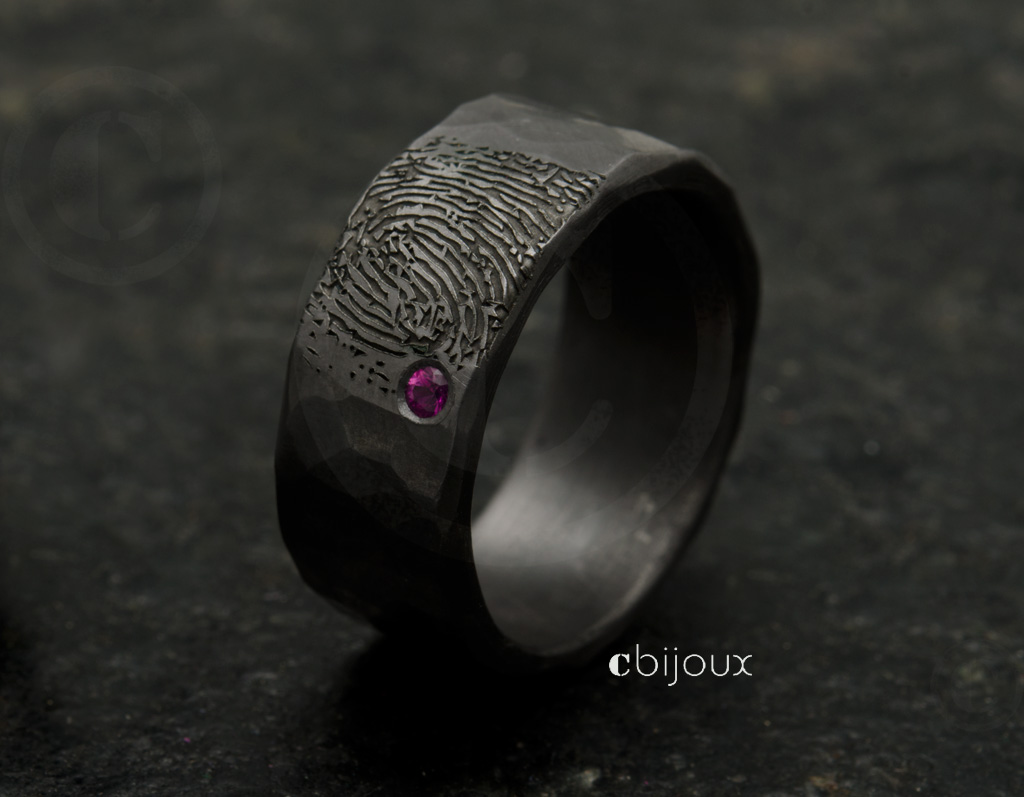 - Anneau en tantale martelé gravure empreinte digitale, gravée au laser . Serti d’un saphir rose .