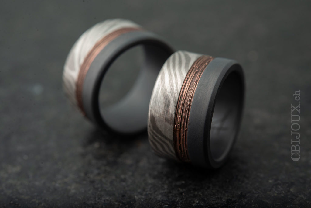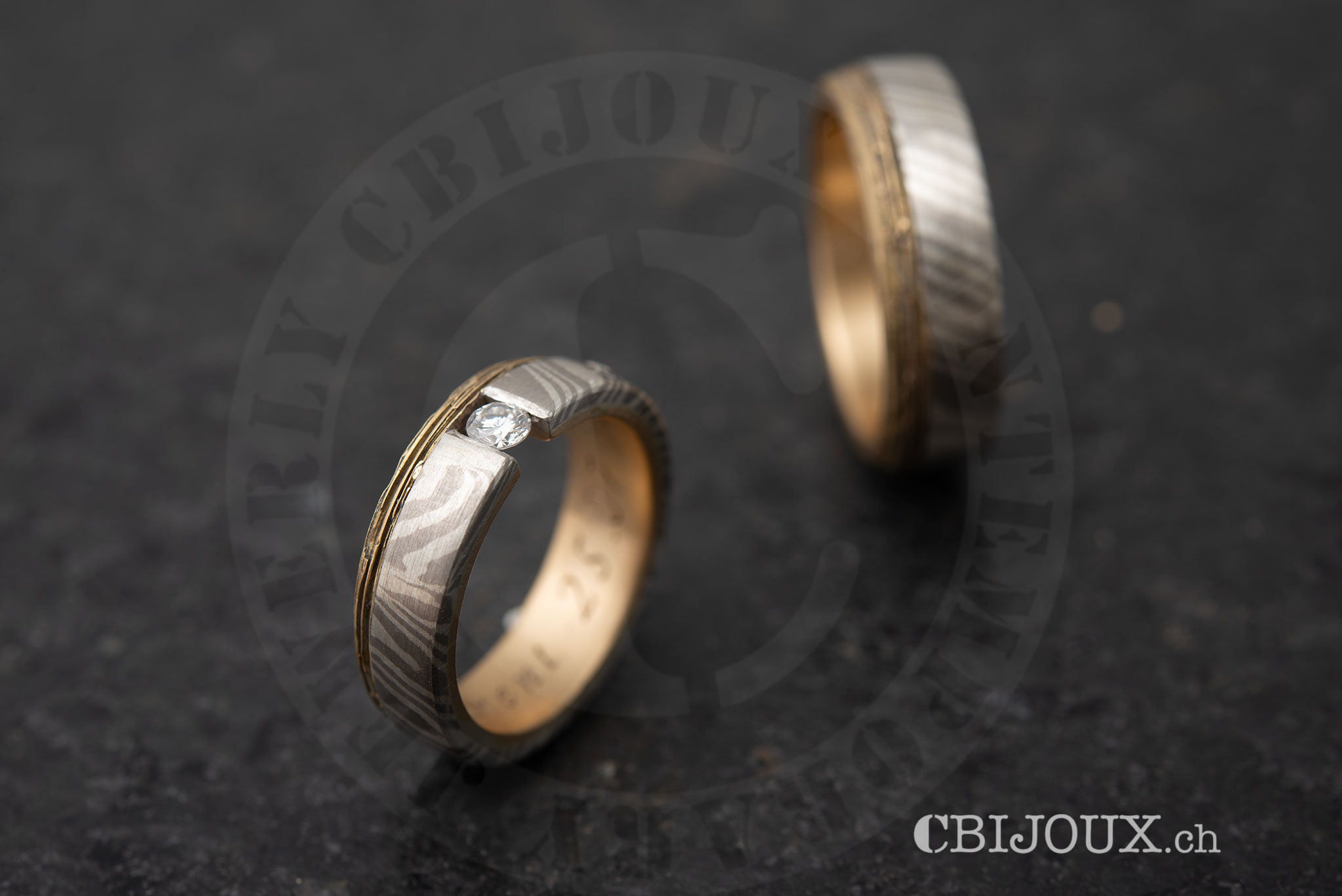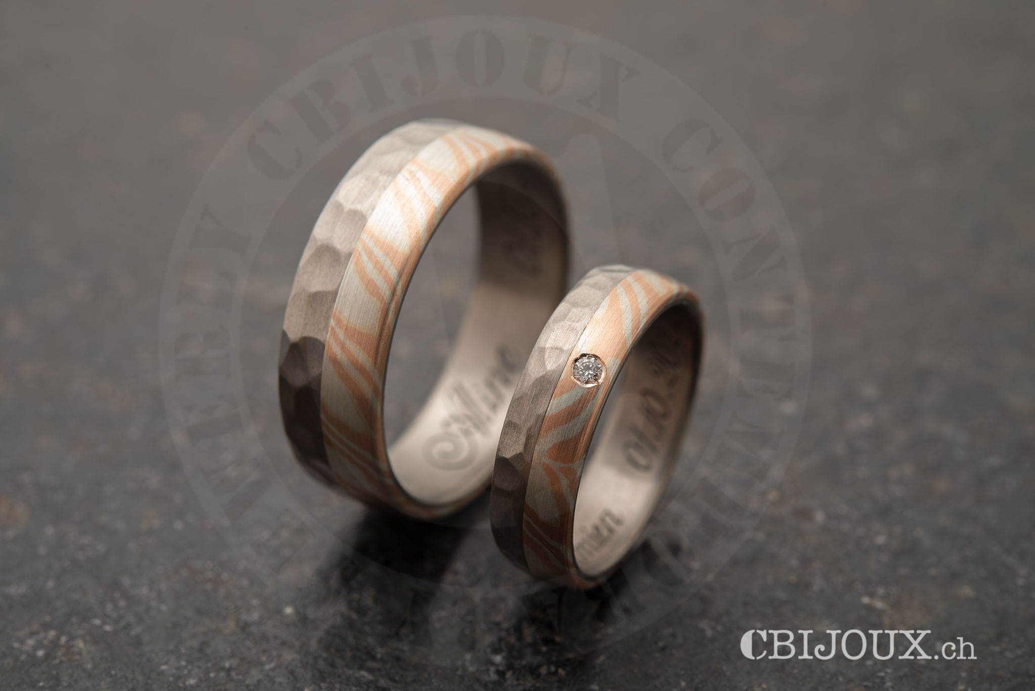Depuis 2001, Cbijoux, atelier suisse fondé par le designer Cédric Chevalley, crée des alliances de mariage, des bagues de fiançailles et des bijoux contemporains sur mesure. Nous forgeons plus d’une centaine de paires d’alliances par an, en mettant l’accent sur la personnalisation et l’innovation. Le mokume-gane y occupe une place centrale, intégré à la collection Mood (lancée en 2004 par Cédric Chevalley), qui propose des pièces disponibles en ligne.